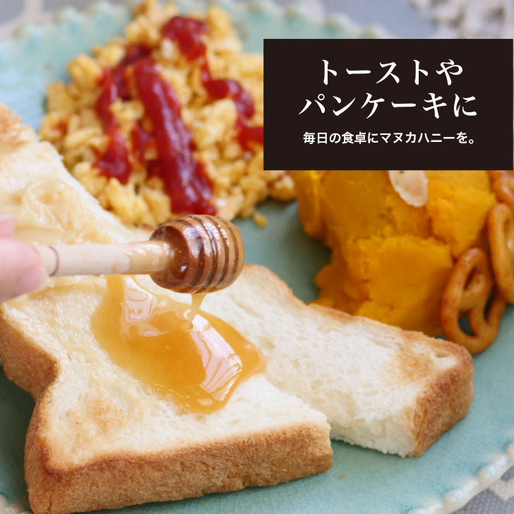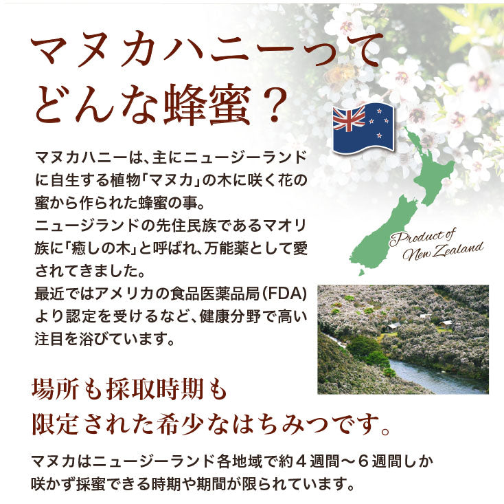 Manuka honey harvested in the central highlands of the North Island has a very mellow, luxurious caramel-like flavor, and is known for being easy to eat and has no peculiar taste, even among Manuka honeys.