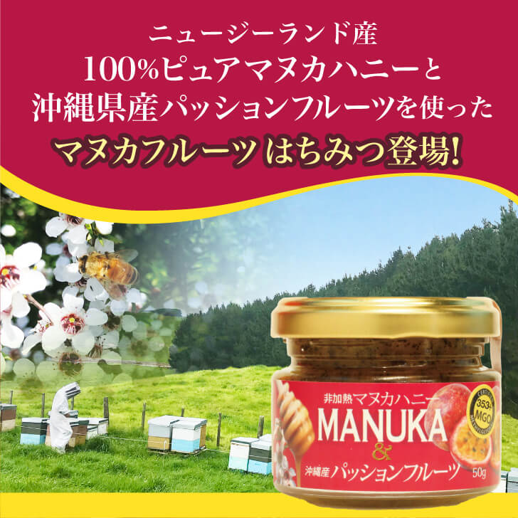 A delicious blend of 100% pure New Zealand Monofloral Manuka Honey and Okinawa passionfruit.