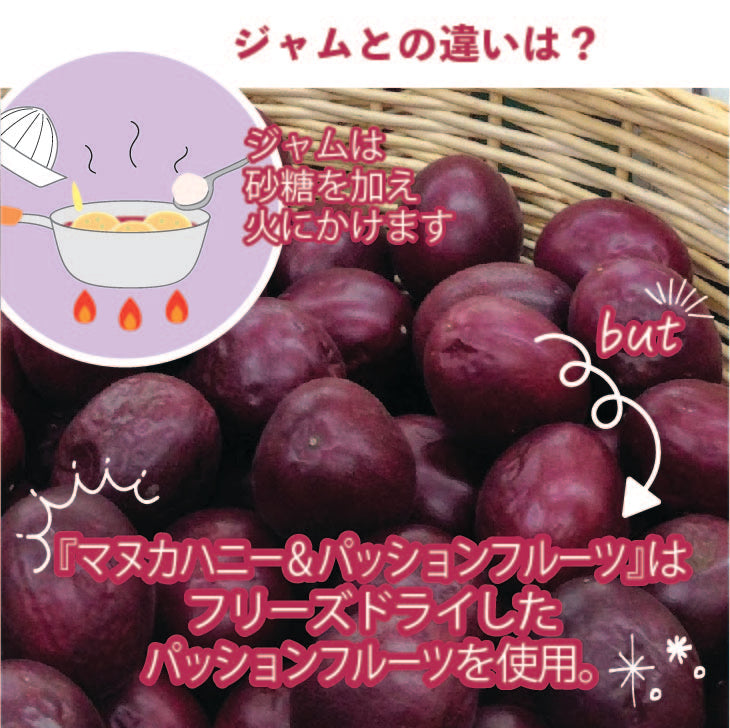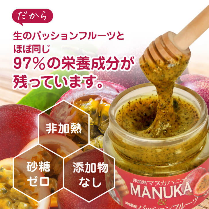 We have taken Okinawa's signature passionfruit and carefully dried it to create a delcious powder that retains all the nutrients of fresh passionfruit. We even leave the the seeds in when we combne it with our Manuka Honey to produce this arromatic and mildly sweet honey with the crunch of fresh passionfruit ♪