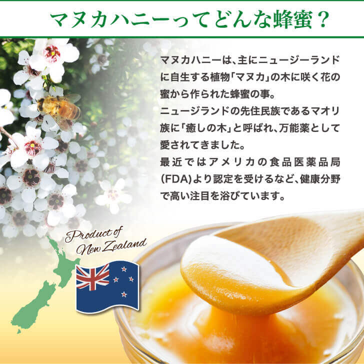 Manuka Honey is often referred to as healing honey. It is rich in Methylglyoxal (MGO). MGO is the major anti-bacterial component of Manuka Honey and comes from the conversion of another compound found in Manuka Honey called dihydroxyacetone (DHA) which is found in high concentration in the nectar of Manuka Flowers.